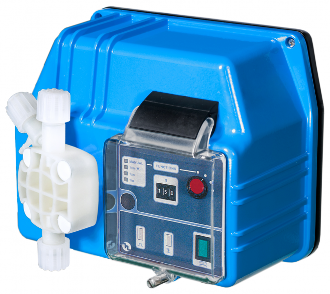 Pompe doseuse murale à microprocesseur pour dosage proportionnel par un contact sec externe (compteur d’eau, régulateur…)